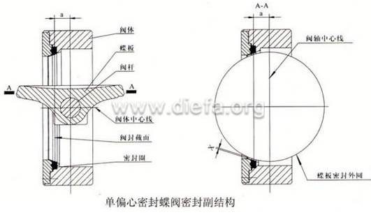 由于蝶板的回轉中心(即閥門軸中心)與蝶板密封截面按a偏心設置,使得蝶閥在開啟過程中,蝶板密封面逐漸脫離閥座密封面,蝶板轉動至20°~25°時,蝶板密封面完全脫離閥座密封面,完全開啟時,兩密封面之間形成間隙x,從而使得蝶閥在啟閉過程中,兩密封面之間相對機械磨損及擠壓大為降低,從而保證了蝶閥的密封。