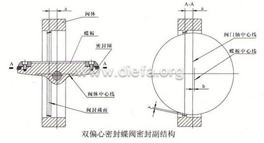 由于在單偏心碟閥的基礎上將蝶板的回轉中心(既閥門軸中心)與閥體中心線形成尺寸b偏置,使得蝶閥在開啟過程中,蝶板的密封面會比單偏心密封蝶閥更快地脫離閥座密封面,蝶板轉動至8°~12°時,蝶板密封面完全脫離閥座密封,完全開啟時,兩密封面之間形成一個更大的間隙y,該類蝶閥的設計,大大降低了兩密封面之間的機械磨損及擁擠壓變形,使蝶閥的密封性能更為提高。