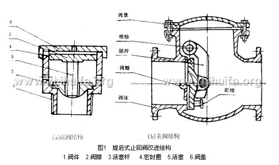 在原旋啟式止回閥閥瓣上增設(shè)緩閉副閥(圖1)。副閥安裝在主閥閥瓣下側(cè)或兩側(cè)且用螺紋聯(lián)接,介質(zhì)正常流動(dòng)閥門開啟時(shí),介質(zhì)壓力將副 閥打開,介質(zhì)通過副閥小孔流入主閥出口端,使主閥進(jìn)水口端卸壓,主閥閥瓣開啟,主閥前后壓力趨于平衡;介質(zhì)逆流時(shí),主閥閥瓣在逆流介質(zhì)作用下快速關(guān)閉,而副閥閥體上部為緩沖缸,副閥閥蓋旋入閥體上部其蓋上有一小孔,副閥閥瓣與其活塞桿空套有一定間隙,活塞與緩沖缸之間采用O型橡膠圈密封,活塞下部與閥瓣之間為平面密封;當(dāng)副閥閥瓣隨主閥閥瓣關(guān)閉而關(guān)閉時(shí),因副閥閥蓋小孔的作用,介質(zhì)通過小孔逐漸流入副閥緩沖缸上腔體,一部分介質(zhì)通過副閥閥瓣與活塞桿之間的間隙倒流,故副閥活塞是緩慢關(guān)閉的。該結(jié)構(gòu)主閥的關(guān)閉相當(dāng)于快關(guān)階段,副閥的 緩慢關(guān)閉相當(dāng)于慢關(guān)階段,依據(jù)泵站機(jī)組水力和機(jī)械過渡機(jī)理說明該結(jié)構(gòu)設(shè)計(jì)能有 效地防止水錘升壓。
