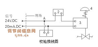 直接由調(diào)節(jié)器或手操器(對(duì)需隔離離柵的回路,還需經(jīng)輸出安全保持器),輸出一個(gè)固定的20mA DC電流。經(jīng)電阻箱分流后,就可以得到一個(gè)既安全又可靠的4~20mA DC信號(hào)。在現(xiàn)場校驗(yàn)定位器時(shí),其接線如圖所示。