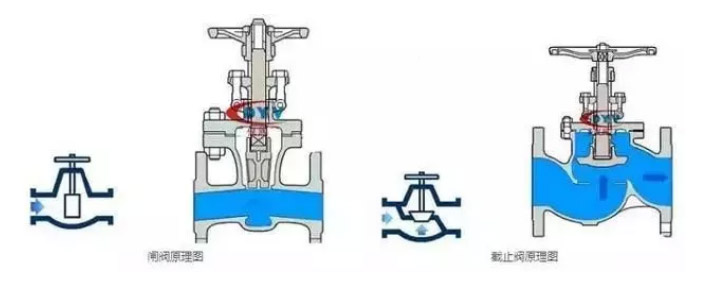 截止閥是低進高出,從外觀看有明顯的管道不在一相水平線上。閘閥流道在一個水平線上。閘閥的行程比截止閥的要大。