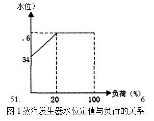 主給水泵的打出來的水經過高壓加熱器后進人一條給水母管,再由此分為兩條給水管路,通往兩臺蒸發器。每個給水調節站包括一個主給水調節閥和一個旁路調節閥,在主調節閥前后設電動隔離閥,每臺蒸汽發生器裝有一個水位控制器,用于使蒸汽發生器保持一個隨負荷變化的預定水位。并聯安裝的主、旁路調節閥進行給水流量調節,以調節蒸發器的水位。主給水調節閥可保證1854t/h的流量(名義流量的 95%),旁路調節閥可保證的流量為293(名義流量的巧%)。當負荷小于18.5%Pn時,旁路調節閥獨自控制;當負荷在1 &5%pn到100% pn之間時,主給水調節閥和旁路調節閥都參與SG水位控制,此時,旁路調節閥保持全開狀態。主給水調節閥和旁路調節閥可用電動閥從上游和下游進行隔離。 圖1給出了蒸汽發生器水位定值與負荷的關系。在(蒸汽)負荷小于20%pn時,程序水位線性的從34%(零負荷時)變化到5L6%(在 20%pn時)。在負荷大于20%Pn時,程序水位是恒定的,并設定為窄量程水位的5L6%。