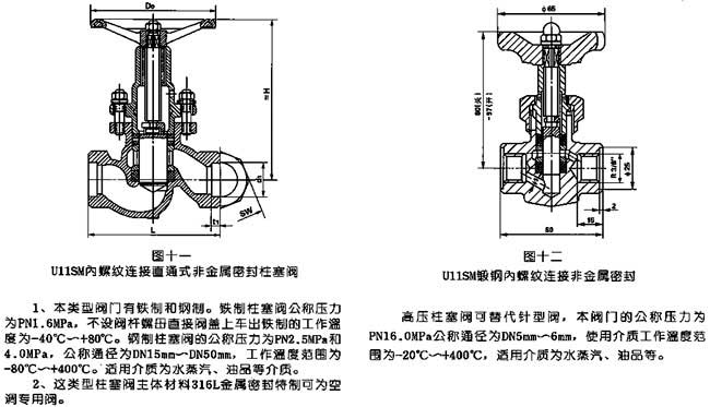 1. 鍛鋼高壓柱塞閥UJ41Y(H)有鐵和鋼制。鐵制柱塞閥公稱壓力為PN1。6Mpa,不設閥桿螺母直接閥蓋上車出鐵制的工作溫度為~40℃~+80℃。鋼制柱塞閥的公稱壓為PN2.5 Mpa和4.0 Mpa,公稱通徑為DN15㎜~DN50㎜,工作溫度范圍為-80℃!+400℃。適用介質為水蒸汽、油品等介質。